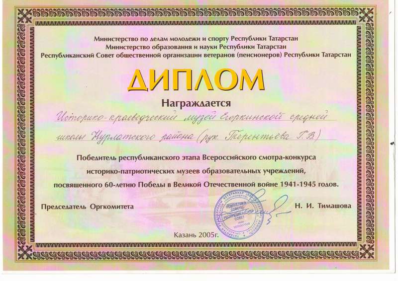В 2005 году Министерство по делам молодежи, спорту Республики Татарстан Министерство образования и науки Республики Татарстан, Республиканский Совет общественной организации ветеранов Республики Татарстан наградили Дипломом (Победитель республиканского этапа Всероссийского смотра-конкурса историко-краеведческих музеев образовательных учреждений, посвященного 60-летию Победы в Великой Отечественной войне 1941-2945 годов), также в 2005 году Министерство образования и науки Республики Татарстан наградил Грамотой за 3 место в Республиканском смотре-конкурсе военно-патриотических и историко-краеведческих школьных музеев, посвященном 1000-летию Казани и 60-летию Великой Победы.