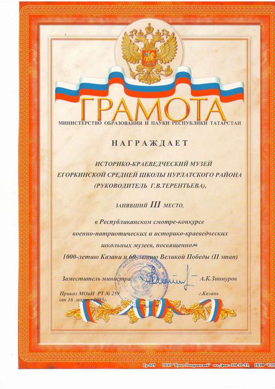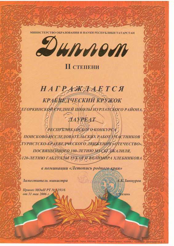 Дипломом II степени награжден в 2006 году лауреат Республиканского конкурса поисково-исследовательских работ участников туристко-краеведческого движения «Отечество», посвященного 100-летию Мусы Джалиля, 120-летию Габдуллы Тукая в номинации «Летопись родного края».